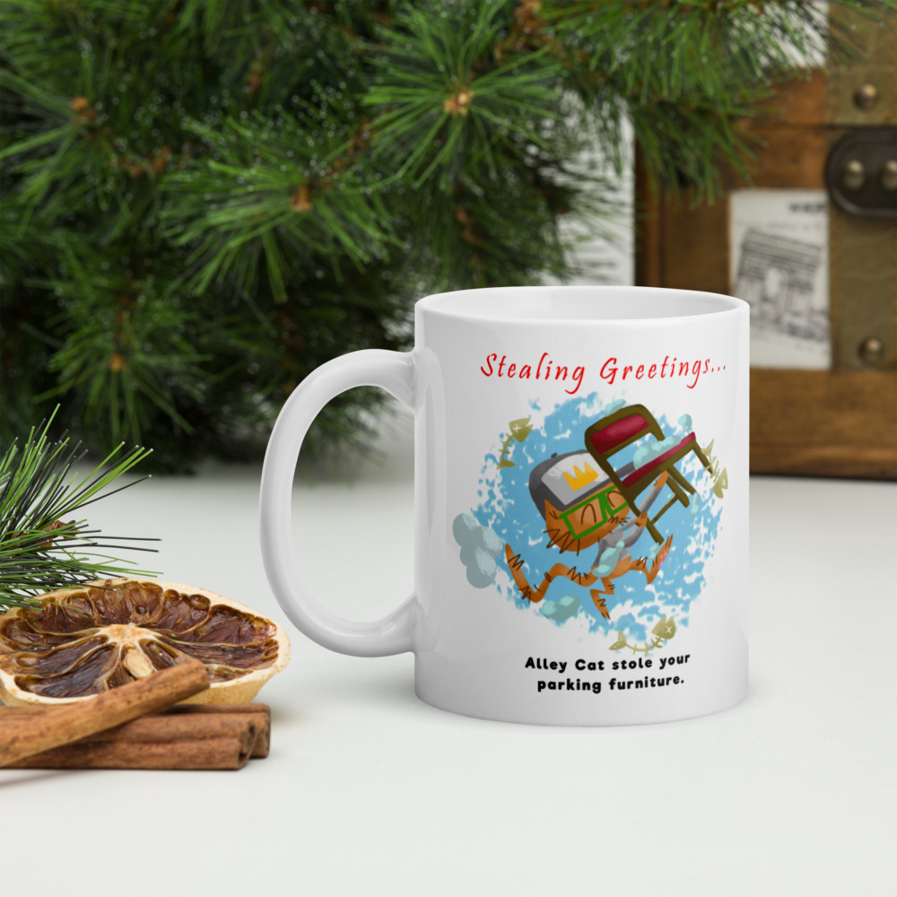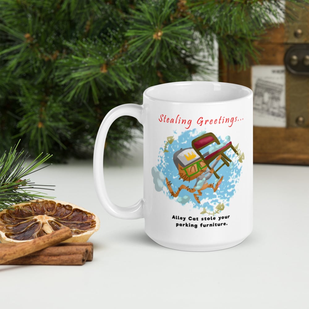 Are you in a city that requires parking space and use furniture? AlleyCat happy to take your parking spot chair in MUG form with this silly STEALING GREETING MUG!